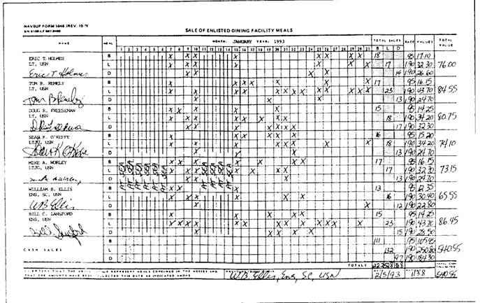 When the CO determines that it is impractical and uneconomical to subsist a small number of officers in the established wardroom during in-port periods, weekends, and holidays, he or she may authorize officers to purchase meals from the GM. At the option of the CO, a GM MS may be assigned the duty of maintaining the NAVSUP Form 1046. The MS should place a check mark or maintain a running total in the appropriate block opposite each name to show consumption of a meal. The form should be posted in a noticeable location where it can be seen by the wardroom mess members. At the end of each month, each mess member signs in the Name block to acknowledge approval of the meal tally. The payment for all meals sold on a credit basis is required no later than 15 days following the month in