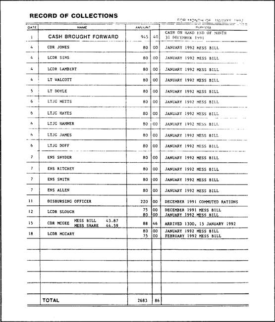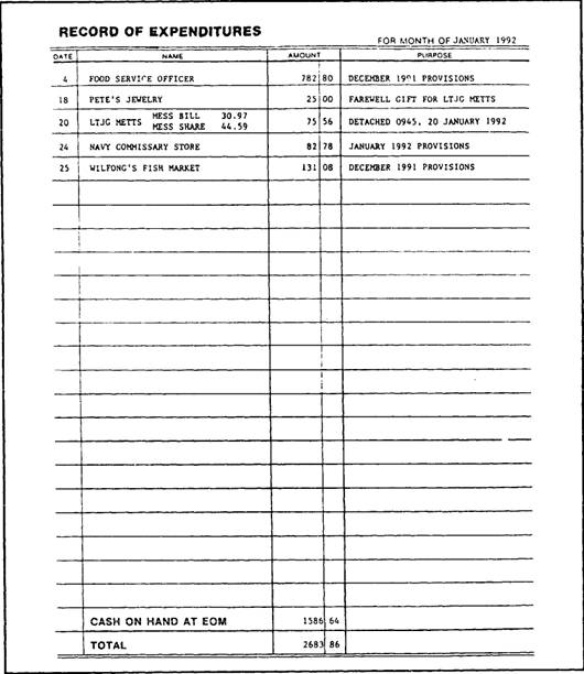 Figure 3-2.-Record of collections. and expenditures of the mess from which the financial condition of the mess can be determined at any time. The treasurer must submit a statement of the accounts of the mess to the commanding officer at the end of the month. The statement must show in detail the money owed by or to the mess, mess receipts and expenditures, and any contracts entered into for future deliveries of supplies. The Nonappropriated Fund Accounting Procedures, NAVSO P-3520, prescribes general financial management policies and principles governing nonappropriated fund activities and the applicable portions governing the financial management of private messes afloat. Additional local controls may be established if desired. ACCOUNTING RECORDS It is necessary to keep accounting records to be able to account for every transaction that has occurred. These records are also used in the preparation of the monthly financial operating statement for messes afloat at the end of the quarter. All mess records are retained for a period of 3 years. Records of Collections and Expenditures These records reflect all collections (or receipts) and expenditures of cash and checks. They are not used to record funds due or owed or the dollar value of materials received or expended. See figures 3-2 and 3-3.