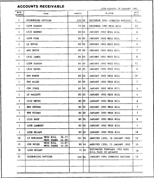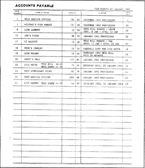 Figure 3-3.-Record of expenditures. Records of Accounts Payable and Accounts Receivable These records reflect the monies owed to the mess and the unpaid debts of the mess. These are closed monthly. All unsettled accounts are carried forward to the following month. See figures 3-4 and 3-5. Records of Mess Members A record must be maintained of members of the mess by member's name, date of membership, and the amount paid for the membership. Upon redemption of the membership the record should show the date the membership was redeemed and the amount for which it