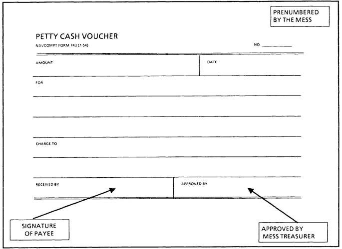 On the first day of the month, list all uncollected Accounts Receivable brought forward from the previous month. Also, list names of all current mess members. At the end of the month, all uncollected Accounts Receivable will be carried forward to the next month's report. Mark CF (carried forward) in Date Received column. Figure 3-5.-Record of accounts receivable. was redeemed. A locally prepared form may be used for this purpose. See figures 3-6. When needed, the commanding officer can authorize in writing the establishment of a petty cash fund. The authorization specifies the amount of cash authorized for the petty cash fund. Payments setting up petty cash funds and the replenishment of such funds are made by check or cash transfer voucher if the mess does not have a checking account. The replenishment of petty cash funds must be substantiated by a signed Petty Cash Voucher, NAVCCIMPT Form 743, and by the dealer's sales slip or receipt. An example of a petty cash voucher is shown in figures 3-7.