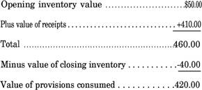 DETERMINATION OF MEALS SERVED Messes must establish a method whereby the total number of meals served is categorically recorded daily. This includes meals served to mess members, guests of the mess, and the number of meals eaten by enlisted personnel. To get the total percentage of meals consumed by each category, divide the number of meals consumed by the enlisted personnel by the total number of meals served; for example: Mess member and guest meals ................. 784 Enlisted personnel meals ............................403 Total meals served ,1,187 Dividing 403 by 1,187 = 33.9%, which is the percentage of meals eaten by enlisted personnel. DETERMINATION OF VALUE OF PROVISIONS CONSUMED Determine the total value of provisions consumed by subtracting the money value of the closing inventory from the sum of the opening inventory and the total receipts during the month; for example: