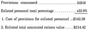 COMPARISON Multiply the value of provisions consumed by the enlisted personnel meal percentage and compare the product with the value of the total commuted rations. The amount payable to the mess is the lesser of the two amounts; for example: