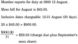 Thus, the lesser amount of 1 and 2 is ($142.38 in this case) paid to the mess treasurer by the disbursing officer. COMPUTATION OF A PARTIAL MESS BILL FOR A NEW MEMBER BEING PERMANENTLY ASSIGNED Members are charged for the day they report aboard unless reporting after 1800. Multiply the actual number of inclusive days for which a mess bill is payable (all days of the month that the member is aboard including the 31st day, when applicable) by the month's mess bill, then divide by the actual number of days in the month and round off to the nearest cent; for example: