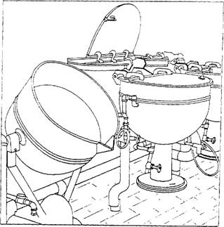 Figkure 4-1.-Steam-Jacketed kettles. Operation The kettles are constructed to operate on a maximum steam pressure of 45 pounds per square inch. When the pressure in the galley steam line exceeds 45 psi, a pressure regulating valve (safety valve) installed in the steam line leading to the kettles is set to release pressure at 45 psi. Do not tamper with the safety valve or tie it closed. It is there to prevent the kettle from exploding. When operating a cold kettle, turn the steam on gradually, allowing the shell to become thoroughly warm before full pressure is applied. After the shell has become warm, and before applying full pressure, open the safety valve by pulling the lever. Opening the safety valve when enough pressure is within the shell removes air from within the jacket and prevents the kettle from becoming air-bound. Cleaning Kettles (or coppers) must be cleaned after each use. General cleaning instructions are as follows: 1. Rinse kettle immediately after cooking. Open draft faucet and flush with water. 2. Soak. Close drain valve. Fill with water above cooking level. If greasy, apply heat. Use a scrub brush to loosen food particles. Drain soak water. 3. Refill and clean. Add detergent, using 1 ounce to 1 gallon of water. Clean interior, hinges, under surfaces of lids, and frame with brush. Drain. Flush out. 4. Remove drain-off faucet and fittings and disassemble drain line. Scrub draw off faucet and fittings with a flexible-handled brush. Pull back and forth through tube under running hot water. Thoroughly clean in detergent water. Carefully rinse with 180F water to sanitize. Drain valves and tubing should also be cleaned and sanitized in a similar way. 5. Scrub exterior and frame. Use hot detergent water and brush. 6. Resterilize interior. Before using kettle, you should carefully rinse with 180F water. NOTE: The previous procedures are recommended for stainless steel kettles. If metals are aluminum, brightening or whitening is required. Boil with vinegar water for a short time period or use a product recommended for cleaning aluminum following the manufacturer's directions. Do not use caustic cleaners or steel pads. If kettles are stainless steel, clean as directed earlier. SAFETY NOTE: Make sure the safety valve is in proper working order before using a kettle ELECTRIC GRIDDLE The griddle consists of cooking surfaces of various sizes up to 34 inches deep by 72 inches wide. Each has a readily removable grease receptacle in the front of the griddle and a splash guard at least 3 inches high at the rear of the griddle which is tapered at the sides. All thermostat dial knobs are conveniently located on the front panel. Each thermostat dial knob has a signal light that indicates the griddle is turned on until the griddle has reached the dialed temperature. Operation To operate an electric griddle, proceed as follows: 1. Carefully read the operating instructions posted near the griddle. 2. Preheat the griddle by turning the thermostat dial knob to the recommended preheating temperature according to the manufacturer's technical manual. 3. Set the thermostat dial knobs at the desired temperature listed on the recipe card of the food to be grilled. A red light will turn on automatically when the griddle dial is initially set and will turn off when the the griddle has reached the dialed temperature. The signal