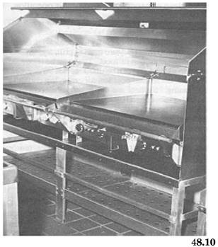Figure 4-2.-Electric griddle. will flash on and off during the cooking process to show the correct temperature is being maintained. You are now ready to load the griddle. 4. Turn the griddle off or to the lowest temperature setting during idle periods. Care and Cleaning Keep the cooking surface scraped and wiped clean at all times. The grease gutters should always be kept clean to help in draining off excess grease and thereby reduce smoke. The grease receptacle should be emptied frequently and thoroughly cleaned at the end of the workday. Before starting the griddle cleaning procedure, always make sure the electrical power is turned off at the main power panel and the correct tag-out procedures have been followed. The cooking surface of most griddles can be satisfactorily cleaned with a pumice stone. Never use water. However, before cleaning, you should read the manufacturer's recommended cleaning instructions for that particular griddle surface. After each thorough cleaning, the griddle should be seasoned. Seasoning is done by preheating the griddle to 400F. When the signal light goes off, spread a light film of cooking oil or fat over the entire surface of the griddle. In 2 minutes, wipe the surface clean of excess oil. Repeat this operation. The griddle is now ready for use. |