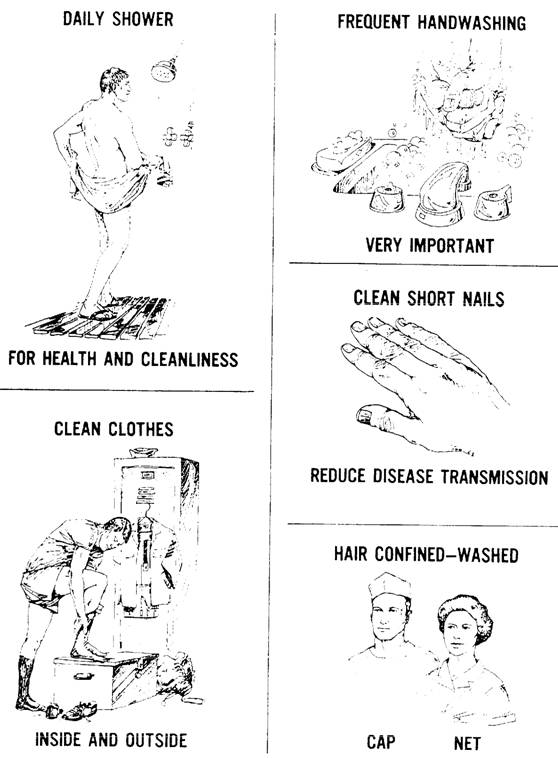 FOOD PREPARATION It is evident that the foodservice worker is the most important link in the transmission of disease through food. The workers' health, personal habits, understanding of bacteria, and the methods of preparing and serving of food are of concern not only to themselves but also to their shipmates as well. BACTERIA An understanding of bacteria is valuable to all personnel and essential to those who work with food in any way. Bacteria are one-celled microorganisms; so small they are visible only under a microscope. They are widely distributed in the air, water, soil, and in animal and plant tissues. Bacteria are classified according to their shape. Those round in shape are called cocci; the rod-shaped ones are called bacilli; and the spiral-shaped ones are called spirilla. Since bacteria camnnot be seen, our best defense against the harmful bacteria is strict adherence to sanitation principles. Bacteria can move of their own accord only in liquids and cannot leave a fluid surface unless transported as "passengers" by other agents such as dust, food dishes, silverware, cooking utensils, dirty fingers or fingernails, a common drinking cup, a hand towel, water, insects, or rodents. Bacteria reproduce themselves simply by dividing in half. On the average each bacterium, under favorable conditions, will divide and become two bacteria every 20 minutes. The rate of multiplication or growth of bacteria is affected by heat or cold. Certain types of bacteria, if allowed to grow and multiply, produce toxins that cause food poisoning. Boiling will kill all bacteria, but it will not kill the toxins once they are allowed to form. Certain strains of the staphylococcus bacteria will withstand boiling temperature for long periods of time before they are killed and are virtually impossible to kill by normal cooking methods. Once toxins have been allowed to form, no amount of cooking will make the food safe. Refrigeration will prevent the bacteria from producing toxins but will not kill the toxins once they are formed. FOODSERVICE PERSONNEL Since foodservice personnel are considered to be the most likely mode of transmission of disease through food, certain requirements such as medical examinations, sanitation training, and personal hygiene must be completed before such personnel can work in food preparation areas. Physical Examination All foodservice personnel including personnel employed by civilian contract services must be examined and determined to be free from communicable diseases before initial assignment in foodservice. Subsequent physical examinations will be conducted annually. The physical examination must be sufficiently comprehensive to detect acute or chronic diseases. Laboratory tests and other diagnostic determinations are performed at the discretion of the senior medical officer; however, all foodservice personnel must be examined for evidence of tuberculosis. Employees of contract services must be examined by either local or military medical departments to make sure a complete and thorough physical examination has been done. Personnel having any open lesions, particularly on the hands, face, or neck or acne on the face, are prohibited from performing foodservice duty. Examination of personnel with questionable medical or social histories must be comprehensive including X-ray of the chest, stool and urine examinations for parasite and bacterial pathogens, and other such determinations as may be indicated by international agreements. All personnel must repeat medical tests when away from duty for 30 days or more. All personnel must submit to laboratory examinations and other tests to detect and treat acute or chronic diseases and be relieved from duty if they are infected. Training All foodservice personnel must be thoroughly indoctrinated in personal hygiene and food sanitation, as well as in the methods and importance of preventing food-borne illness. Temporary foodservice personnel must be indoctrinated as follows: All foodservice personnel will receive a minimum of 6 hours' initial training and 6 hours' annual refresher training in foodservice sanitation principles. All foodservice sanitation training will be conducted by environmental health officers and/or preventive medicine technicians. In those cases where it can be shown that environmental health officers or preventive medicine technicians are not available to perform such training, medical department representatives, MSs in paygrade E-5 and above, or civilian foodservice supervisors who have received special training to qualify them as foodservice sanitation instructors maybe used. Special instructor certification training may be taken at either a Navy environmental and preventive medicine unit or naval regional medical center preventive medicine service, and completion of training must be documented. Certified instructors must use and maintain up-to-date, standard Navy lesson plans in their training programs. Instructors must be recertified every 3 years and are authorized to sign the Foodservice Training Certificate, NAVMED 4061/1. Personal Hygiene The group of principles and rules designed to promote personal health and cleanliness is known as personal hygiene. The following procedures should be used to ensure personal cleanliness. TAKE DAILY SHOWER OR BATH.- Maintain a high degree of cleanliness by thoroughly soaping and rinsing the body to remove dirt, perspiration, and bacteria. This practice improves circulation, appearance, and health, and is the foundation of personal hygiene. Frequent washing of hair is mandatory. Keep teeth clean by brushing at least twice daily, but preferably after each meal. WEAR CLEAN GARMENTS.- Wear clean inner and outer garments. Germs are harbored in clothing as well as on skin surfaces, and diseases are likely to be transmitted. Caps (or hairnets for women) completely covering the hair must be worn at all times when working with food. Keep hair trimmed for neat appearance. Change cl