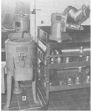 Figure 4-11.-Vegetable peeler (view A) and vegetable cutter (view B). the peeling finished with a hand peeler or small knife. It is wasteful to allow vegetables to remain in the machine longer than necessary because valuable nutrients will be lost. Cleaning At the end of each day's use, secure the power and dismantle the machine. Lift the cover off and take out the abrasive disks; remove the peel trap and strainers; wash the removable parts, the interior, and the exterior of the machine with hot soapy water, and rinse with hot water (170F). Be sure all food particles are washed out. Allow all parts to air dry before reassembling the unit. |