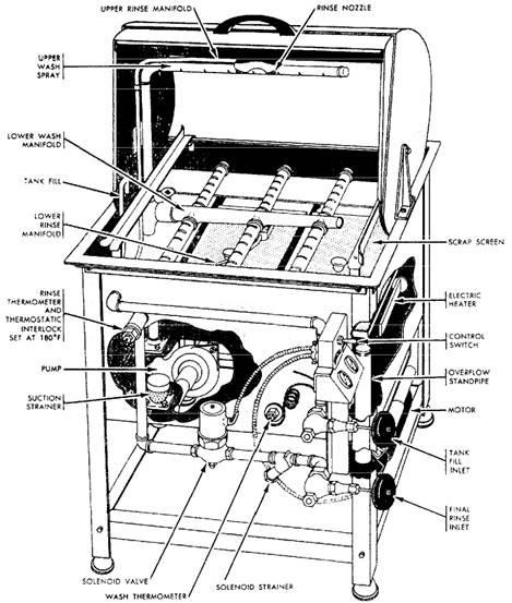 DISHWASHING MACHINES Proper operation and care of dishwashing machines are vital to the sanitation, safety, and efficiency of your activity, so you must know your machines and follow directions for their use and maintenance. Dishwashing machines used in the Navy are classified as one-tank, two-tank or three-tank machines. The three-tank machine is a fully automatic, continuous racking machine that scrapes, brushes, and provides two rinses. It is used at major recruit installations and other large activities. Single-tank Dishwashing Machine Single-tank machines are used in small ships or small messes whereby installation of larger dishwashing machines is not feasible and practical. Wash and rinse sprays are controlled separately by automatic, self-opening, and self-closing valves in the automatic machine, or by handles in the manually operated machine. The automatic machine provides for a 40-second wash and a 10-second rinse; for manually