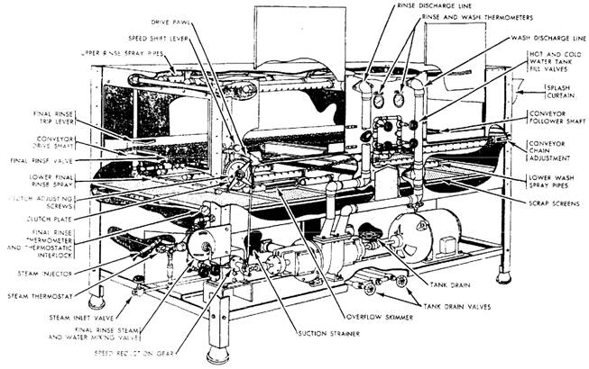 operated machines, wash and rinse intervals are controlled by the operator who should allow a 40-second wash and a 10-second rinse. To control the bacteria to a satisfactory minimum in single-tank machines, it is necessary that the temperature of the wash water in the tank be 140F to 160F. Therefore, a thermostat is provided in the automatic machines to prevent operation when the temperature of the water falls below 140F. Rinsing is done by means of spraying hot water on the dishes from an outside source and is controlled by an adjustable automatic steam-mixing valve that maintains the temperature of the rinse water between 180F to 195F. Double-tank Method Double-tank machines are available with several different capacities and are used when more than 150 persons are to be served. These machines are provided with separate wash and rinse tanks. They also have a final rinse of hot water that is sprayed on the dishes from an outside source. This spray is opened by the racks passing through the machine. The spray automatically closes when the rinse cycle is completed. The final rinse is controlled by an adjustable automatic steam-mixing valve that maintains the temperature between 180F to 195F. Double-tank machines are also equipped with a thermostatically operated switch in the rinse tank that prevents operation of the machine if the temperature of the rinse water falls below 180F. The racks pass through the machine automatically by means of conveyor chains. The two-tank dishwashing machine should be timed so that the utensils are exposed to the machine sprays for not less than 40 seconds (20-second wash, 20-second rinse). Triple-tank Dishwashing Machines Some shore activities have triple-tank dishwashing machines installed. The procedures of operation are basically the same as with double-tank machines with the following exceptions: The dishwashing machine consists of prewash, wash, and rinse sections with a final rinse. Refer to the manufacturer's operating and instruction manual for the preset temperatures of the