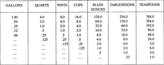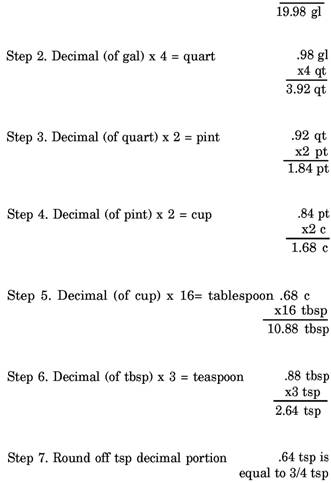 Thus, the amount of water needed for 333 portions is 19 gl, 3 qt, 1 pt, 1 c, 10 tbsp, and 2 3/4 tsp. CONVERTING AND ROUNDING CALCULATED QUANTITIES.- When a recipe is increased or decreased or ingredient quantities are altered it is usually necessary to convert the amount calculated to another unit of measure because, in most instances, a part of a pound or a partial measure results. To obtain a usable figure, (a) round off the calculated figure given in decimal pounds or measures to a whole figure or (b) convert partial pounds into ounces and the partial measures into smaller units; for example, partial quarts into cups. CONVERTING FRACTIONAL WEIGHTS.When increasing or decreasing recipes, the division or multiplication of pounds and ounces is expressed as decimals to simplify cumbersome fractions. For example, if the quantity of an ingredient is multiplied by a working factor, the calculation is as follows: