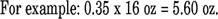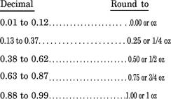 The quantity, 4.35 pounds, could be expressed by converting the fractional part of the pound into ounces. Another means of converting fractional parts of a pound is to make the calculation instead of consulting the conversion table. The part of the pound is converted to ounces by multiplying the figure by 16 ounces.