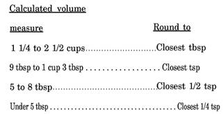 Using the previous example, the 4.35 pounds (or 4 pounds 5.60 ounces) would be rounded to 4 pounds 5 1/2 ounces. ROUNDING OFF VOLUME MEASURES.When converting volume measures, rounding off is also necessary. Round off volume measures as follows: Calculated volume