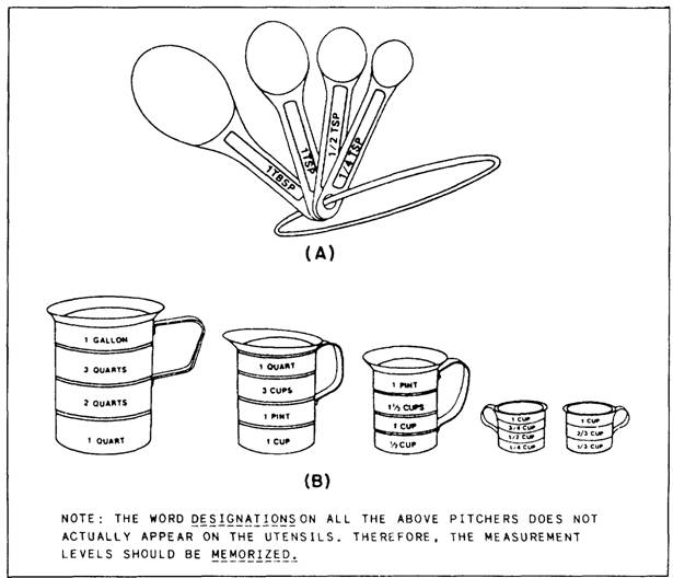 Figure5-6.-Measuring utensils (views A and B). 4. The scoop holds ingredients being weighed. The scale must be balanced to the scoop (as explained later). 5. The slide bar is divided into 1/4-ounce increments. 6. The basic scale, with scoop, can weigh amounts from 1/4 ounce to 16 ounces. 7. Counterweights placed on the weight plate weighing more than 16 ounces come in 1-, 2-, and 4-pound sizes. Maximum capacity of the scale with counterweights is 8 pounds. BALANCING THE SCALE.- The procedures used to balance the scale are as follows: 1. Place scale on a level surface; then add scoop. 2. Move the slide bar weight completely to the left. 3. Balance the scale to the scoop. If the scale is badly out of balance, lead pellets should be added beneath the weight plate. USING THE EVEN BALANCE SCALE.- To use the scale proceed as follows: 1, Place wax paper in scoop. 2. Add weights, as required, to weight plate of scale. 3. Adjust slide as required. 4. Place ingredients on wax paper until scale balances. 5. Remove wax paper with ingredients from the scoop and set it aside. CARE OF THE SCALE.- Wipe the scale with a damp cloth or sponge. Never put the entire scale into the deep sink because it will eventually rust.
