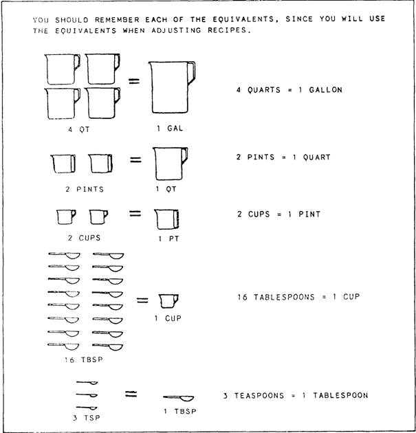 To convert volume measures from gallons, quarts, cups, tablespoons, and teaspoons, se i r - Measuring Utensils.- Measuring utensils include both measuring spoons and volume measuring pitchers. Measuring spoons view A) are used for both liquid and dry ingredients and come in four basic sizes. Measuring pitchers f1g' ~- view B) also come in four basic sizes (gallon, quart, pint, and cup) and are described as follows: 1. The 1-gallon measure is used mostly for liquids. Markings go completely around the utensil in 1-quart increments. 2. The 1-quart measure is used mostly for liquids. Markings go completely around the utensil in 1-cup increments. 3. The 1-pint measure is used mostly for liquids. Measurement markings go completely around the utensil in 1/2-cup increments. 4. The 1-cup measure is used for both liquid and dry ingredients. Measurement markings are on both sides. a One side is marked in 1/4-cup, 1/2-cup, 3/4-cup, and 1-cup increments. b. The other side is marked in 1/3-cup, 2/3-cup, and 1-cup increments. Measuring utensils are accurate and easy to use. However, they must be used properly to obtain high-quality products. I Figure 5-71 shows the measurement equivalents for both types of measuring utensils. Even Balance Scale.- The even balance scale EUI is normally used to weigh solid and dry ingredients before mixing. It may also be used to weigh products shaped or formed during preparation to ensure portion control. i ure 5-8 also shows the parts of the even balance scale. These parts are explained as follows: 1. The stand (or base) supports the entire mechanism. 2. The weight plate is where the counterweights are placed for weighing ingredients. 3. The location of the slide bar and the scoop plate.