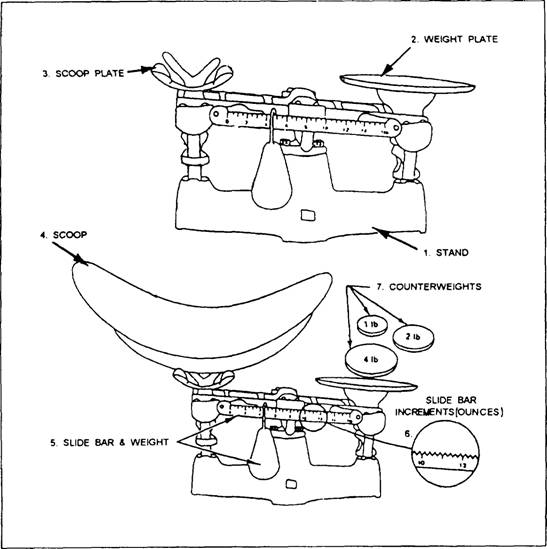 Figure 5-8.-Even balance scale. hours should be considered unsafe for consumption and discarded. The exception to this rule is reconstituted dehydrated egg mix. Reconstituted egg mix, if not used immediately, must be placed in a tightly covered container in the refrigerator and used within 1 hour. If foods are refrigerated at intervals and then intermittently permitted to warm up, the total time of the various periods between 40F and 140F must not exceed 4 hours. Protein foods composed of ingredients that are hand-peeled, hand-sliced, or hand-diced after they are cooked should never be used as leftovers. The 4-hour limit between temperatures of 40F and 140F is usually taken up in preparing, chilling, and serving these foods. Such foods include, but are not necessarily limited to, potato, chicken, turkey, macaroni, shrimp, and egg salads. Hand preparation not only increases the chances of contamination, but also increases the length of time that these foods have been held at room temperature. You should not return opened jars or bowls of mayonnaise and cooked salad dressings from salad bars to refrigerators for reuse at a later meal because of the danger of miscalculation of total lapsed time that these salad dressings have been held at temperatures between 40F and 140F. Instead, mayonnaise and cooked salad dressings should be placed on the salad bar in small quantities and must not be returned from the salad bar for reuse. If economically feasible, individual packets or servings of items such as catsup, mustard, and mayonnaise should be used on the salad bar. This will prevent waste and be more sanitary. Care of Leftovers When leftovers or warm foods are chilled, care should be taken to ensure prompt and thorough chilling (40F or below) to the center of the food mass. Foods that are to be refrigerated should be placed in shallow pans to a depth of not more than 3 inches and should be covered with lids or waxed paper. Large deep pans must not be used since the center of the food may remain warm long enough to permit the growth of harmful bacteria. Foods to be chilled must be placed in the chill box immediately and the containers labeled with the time and date of preparation. Do not save leftovers for more than 36 hours. Freezing leftovers is prohibited. |