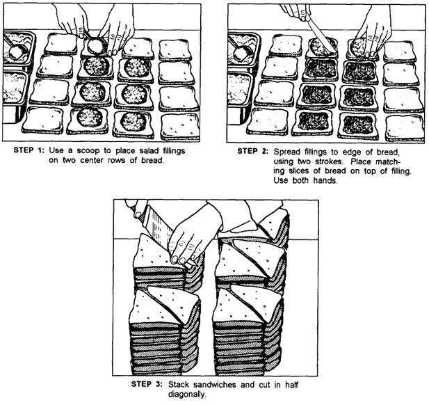 Sandwich Variations The description and preparation methods for some of the sandwich variations are as follows. CLUB SANDWICHES.- Club sandwiches are made with three or more slices of toasted bread and two different fillings, one in each layer. Each sandwich is cut into quarters to form triangles. Toothpicks maybe used, if necessary, to hold layers together. GRILLED OR TOASTED SANDWICHES.- In grilled or toasted sandwiches the filling is often cheese placed between two slices of bread. The top and bottom of the sandwich is spread with melted butter or margarine, and the sandwich is grilled on both sides. Also, these sandwiches may be lightly brushed with melted butter, placed in sheet pans, and toasted in the oven. OPEN-FACED SANDWICHES.- Open-faced sandwiches may be either one or two slices of bread covered with any desired filling including slices of meat, cheese, or tomatoes. When two slices of bread are used, they are placed side by side rather than one on top of the other. SUBMARINE SANDWICHES.- Submarine sandwiches (hero, hoagie, grinder, or poor boy) are prepared from French bread or a hard roll cut in half lengthwise. Each half is spread with salad dressing. Layers of thinly sliced salami, bologna, cheese, ham, tomatoes, and lettuce are then arranged on the bottom half. The sandwich is covered with the top half and cut vertically into portions. If these sandwiches are used for box meals or bag lunches, the salad dressing, tomatoes, and lettuce should be portioned and wrapped separately. SLOPPY DOES.- Sloppy Joes are sandwiches made with barbecued ground beef spread between halves of toasted sandwich buns. HOT SANDWICHES.- Hot sandwiches are usually served open-faced with sliced meat and gravy. However, they are often served with a soup, a potato, and vegetables. They are good main dishes for lunch or dinner when served this way. FINGER SANDWICHES.- Finger sandwiches are two slices of bread with a filling such as tuna, egg, or ham salad cut into three rectangular strips. Finger sandwiches are normally served as appetizers or for ceremonial occasions. Because these sandwiches contain salad mixtures, they should not be used in box lunches. Sandwich Production To make many sandwiches quickly, follow the steps shown in ure 5-10. Have all sandwich material ready, allow ample work space. Sanitary procedures and precautions must be strictly followed in the preparation and serving of sandwiches. Some of these procedures and precautions are listed next. Fillings for cold sandwiches are highly susceptible to bacterial contamination, and every precaution should be taken when preparing and serving sandwiches. Never allow sandwiches to stand at room temperature for more than 4 cumulative hours. This 4-hour period includes the time spent chopping or dicing food after it has been cooked. If the sandwiches will not be consumed immediately, they must be held at temperatures below 40F.