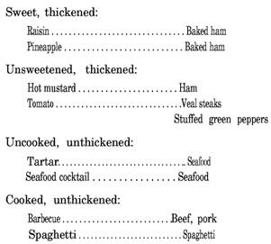 Sauces Sauces add to the appearance and flavor of food, but they should never be overpowering. Sauces should be handled carefully to avoid contamination and food-borne illness. Store in a chill space and never hold them longer than 4 cumulative hours at temperatures between 40F and 140F. CREAM OR WHITE SAUCE.- Cream or white sauces are made with butter or margarine, flour, and milk and have many variations. These sauces must be cooked over low heat. They require constant stirring to avoid scorching. The sauce is cooked until it coats the back of the spoon. Thin and medium white sauces are used to bind ingredients together in scalloped meat, fish, egg, and vegetable dishes. Medium white sauce may also be served over food. BUTTER SAUCES.- A white sauce with a high percentage of butter and little or no seasoning other than salt is considered a butter sauce. This sauce is used principally with green vegetables, such as asparagus and broccoli, and with fish and shellfish. OTHER SAUCES.- Sauces served with meat, chicken, seafood, omelets, and spaghetti are prepared according to recipes in the AYRS. Also, commercially prepared sauce mixes are available. These include basic tomato, sweet and sour, cheese, barbecue, taco, and enchilada sauces. Directions for use are found on the containers. Some examples of sauces and their uses are as follows: