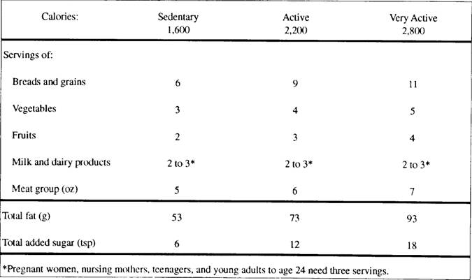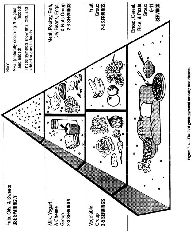 FOOD GUIDE PYRAMID In April 1991, the Secretary of Agriculture unveiled the food guide pyramid, which replaced the basic four food groups. This pyramid is a visual companion to the Dietary Guidelines for Americans. The new graphic conveys the three essential elements of a healthy diet: proportion, moderation, and variety. Proportion is the relative amount of food to choose from each major food group. Moderation is eating fats, oils, and sugars sparingly. Variety emphasizes the importance of eating a selection of different foods from each of the major food groups every day. Figure 7-2 illustrates the range of caloric intake and servings needed from each major food group based on activity level. NOTE: The minimum suggested servings on the pyramid are the minimum number of servings needed each day to stay healthy, even when trying to lose weight. The food pyramid graphically communicates the message of the Dietary Guidelines for Americansdiets should be built upon a base of complex carbohydrates and less fat. The placement of the food groups starting at the base of the pyramid conveys the current recommendations. These recommendations are as follows: eat more grains, vegetables, and fruits; eat moderate amounts of lean meats and dairy foods; and use sweets, fats, and oils sparingly. The food guide pyramid graphic fi -1 shows that all food groups are important to the diet. Grain, Cereal, Rice and Pasta Group The food pyramid emphasizes whole grain and cereal foods as the basis of a nutritious diet. Wheat, corn, oats, and other grains have very little fat and are cholesterol free. These foods provide complex carbohydrates-an important source of energy, especially in low-fat diets. They also provide fiber. A person needs 6 to 11 servings from this group daily, depending on their activity level. You should offer whole grain and enriched or fortified products, but be sure to include some whole grain bread or cereals. WHAT IS A SERVING?- It includes all products made with whole grain or enriched flour or meal such as bread, biscuits, muffins, waffles, pancakes, cooked or ready-to-eat cereals, cornmeal, flour, grits, macaroni and spaghetti, noodles, rice, rolled oats, and barley. The following are some examples of a typical serving from the grain group: 1 slice of bread 1/2 cup of cooked cereal, cornmeal, grits, macaroni, noodles, rice or spaghetti Table 7-2.-Range of Caloric Intake and Servings Needed Based on Activity Level