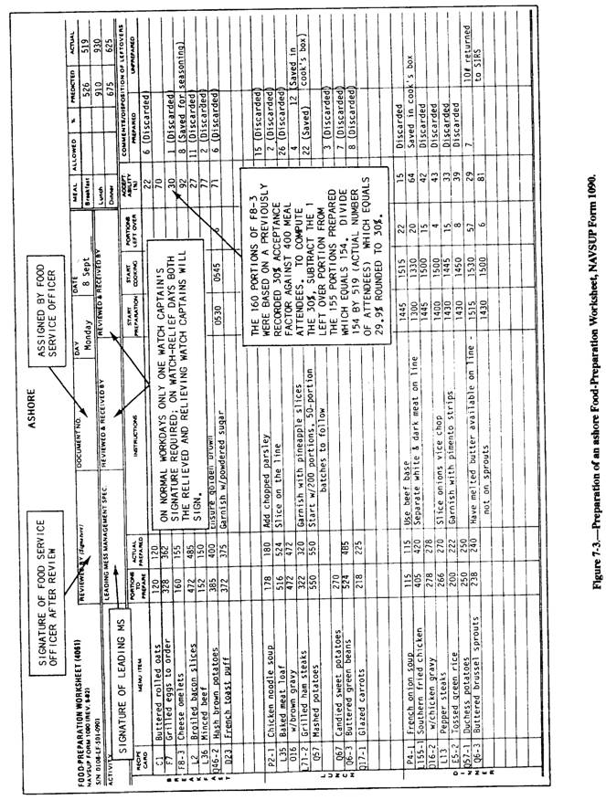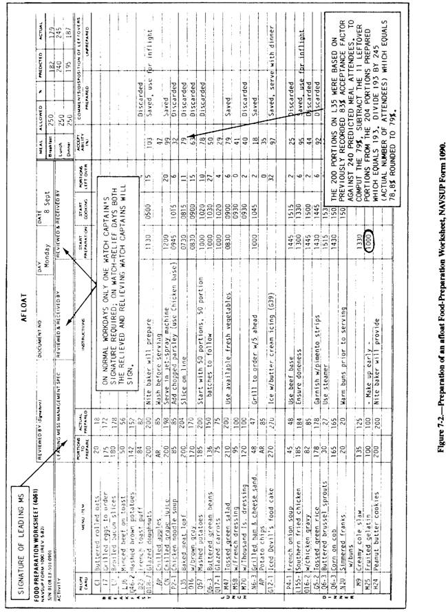 relative popularity. A questionnaire may be developed on which the patrons indicate their preference for various items. The manner in which the foods are described, the instructions given with the questionnaire, and where and when it is filled out are important factors to consider if you are to obtain good reliable data. The most commonly used food preference questionnaire is a rating scale given to each person attending the meal or at some other appropriate time. This type of questionnaire is easily tabulated and is reliable because checking or circling a block is all that a person is required to do. Food preference questiomaires can determine which single food items are most or least popular, their desired frequency of use on a menu, and what menu combinations are most or least liked. An example of how to canvass for opinions on single food items is given in figure 7-4. These food preference questionnaires should be updated periodically because tastes change, new personnel come aboard, and new items are procured. Another type of questionnaire used may prove beneficial to the menu planner and the MS. This questionnaire is completed by the MS on watch concerning the meal just prepared. |