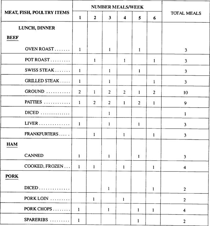 Figure 7-6.-Sample meat plan. are plotted on a frequency chart, spaced on a spacing pattern, and finally entered on the menu draft. Frequency charts and spacing patterns form the framework of the menu and like the meat plan, are developed before the menu is drafted. Frequency charts are developed for each major menu item or section; that is, the meat, poultry, fish entrees, potatoes or potato substitutes, vegetables, salads, desserts, soups, and breads that form the basic menu structure. These charts serve as the advanced plotting of what to feed at which meal (breakfast, lunch, or dinner) and how often. An example of a vegetable frequency chart is shown ix Spacing pattern (ig. 7- show when the item will be served With a spacing pattern, the menu planner can plot a balanced distribution of food items so that there is an appropriate interval between the less popular items that are served, and so that the menus are not beef heavy or corn heavy. Revision.-An important step in the final review of cycle menus is the use of the frequency chart to check the menu for repetition. This is done by listing the number of meals containing each type of food. Then checking that the spacing of similar items, such as ground beef, is adequate, that different methods of preparation are used, and that the basic menu features a