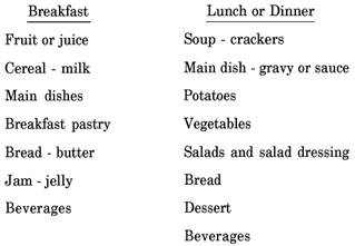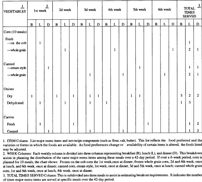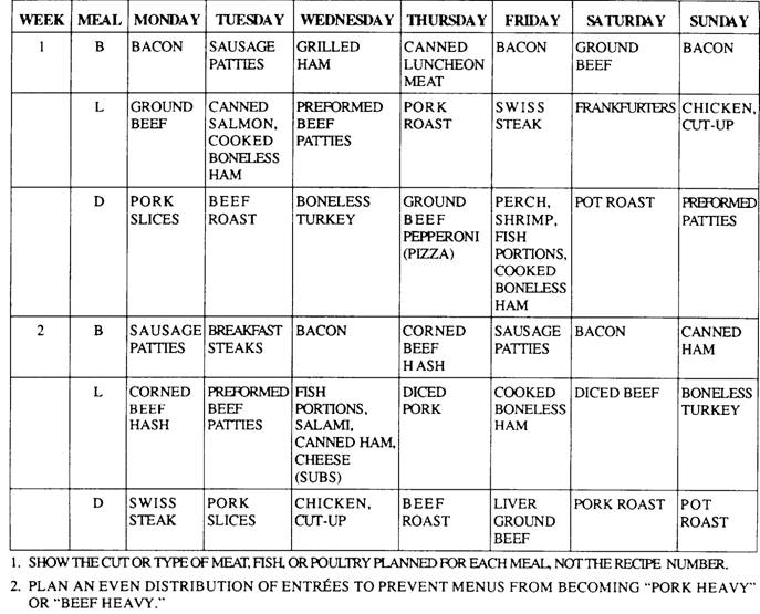 Adjusting Meals for Climate The menu is seasonal in the sense that plans are altered to include the special foods featured for each season. Foods in season have a higher quality, are usually cheaper, and are better flavored. Adjusting Navy meals for the climate should also take into account the great variation in climatic conditions under which Navy ships and shore stations operate. Menu plans should be made to suit the weather in which you are operating. Food needs differ, and appetites usually change with variations in temperature. Crisp, cool, fresh finds are appealing to the patron in hot weather. Heavier, heartier foods such as hot soups, stews, and hot cereals are welcomed in cold weather. Fresh fruits and vegetables are at their highest quality and lowest price at seasonal peak. In hot weather, a variety of beverages, including fruit juices, should be available. LOADING GUIDES.- The best guides for planning menus and determining loading requirements are accurate records of a ship's own past usage and menu plans or menu summaries of previous extended cruises. Usage data and menus used during extended cruises should be collected to provide a basis for balanced loading for future deployment. The 45-day Subsistence Endurance Base (SEB) contained in Food Service Management, NAVSUP P-486, volume I, is a guide that can be used with ship's usage data in planning menus and load lists for 60-, 75-, 90-, and 120-day operational endurances. Menus not only affect the health and morale of the crew, but also directly affect the endurance of a ship. Endurance requirements vary among ship types and classes, and the amount of food storage space varies even between ships with identical complements. Proportionately smaller quantities of perishable foods are available on extended cruises, and this calls for increased use of semiperishables, particularly ration-dense foods. FREQUENCY CHARTS.- Developing a meat plan, frequency charts, and spacing patterns are necessary preplanning functions that assure an acceptable, appealing menu that is also within the daily monetary allowance. A meat plan also called a meat block shows the number of times the various types of meat (including breakfast meats), fish, poultry, and cheese are to be used each week on the cycle menu. This planned usage is directly related to the relative costs of these items, their relative popularity, and their availability. A planned pattern of usage during the cycle menu period will enable you to balance the use of expensive, moderately expensive, and inexpensive meat items. Construction.- The menu planner uses past menus that have known acceptability, the inventories of stocks on hand, and the Federal Supply Catalog, Federal Supply Group 89, Subsistence, as guides for developing the meat plan. When the meats have been chosen, they