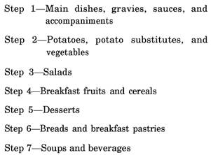 Figure 7-9.-A Menu Draft, NAVSUP Form 1092. When all entrees for the cycle have been entered on each week's draft, it is good management to review the drafts to determine the following: (1) whether the proper variety and balance are maintained, (2) if higher portion cost entrees are balanced with lower portion cost entrees, and (3) if preparation of the entrees is within the capabilities of galley personnel and equipment. Vegetables.- Frequency charts are developed for both potatoes or potato substitutes and vegetables in conjunction with the meat frequency charts so that the items selected will complement the meat, fish, or poultry item planned for each day. Entering the potato or potato substitute and vegetables on the menu draft is the second step in menu planning. Variety of preparation of the entree items should be introduced on the menu by the selected recipe card. Salads and Salad Dressing.- The AFRS offers many varieties of salads and kinds of salad dressings, as well as recipes for relishes. These numerous recipes are a fine foundation for a varied bar of consistently high quality. An array of salads and relishes can be prepared from the excellent variety of fresh, frozen, and canned fruits and vegetables available. When you are selecting salads for the menu, planning is needed to achieve variety and to avoid costly leftovers. Because the salad bar generally offers some variety, there is a temptation to offer the same assortment daily. With good planning, changes from day to day can be achieved. When you are planning for salads and relishes, there are several factors to consider: (1) seasonal availability for procurement, (2) temperature and climate, (3) equipment and labor, and (4) combinations of salad ingredients. Select a salad dressing suited to the salad ingredients on which it is to be used. Use tart dressings with bland-flavored salads. Consult your Foodservice Operations, NAVSUP P-421, for ideas. Breakfast Fruits and Cereals.- Steaming hot cooked cereals are a welcome and warming component of a hearty breakfast in cold weather. Warmer climates and higher temperatures tend to swing the popularity pendulum toward dry, ready-to-eat cereals. Offer a choice of fruit and juice each day to make sure a good source of vitamin C is available to the patrons. Either the fruit or the juice should be citrus or tomato. In addition, fruits can be used to introduce variety on the menus; for example, raisins in oatmeal or rice, blueberries in pancakes, and apples in fritters. Desserts. - Desserts should be individualized to each meal just as other menu components, taking into account the patrons' preferences and other factors influencing the menu, such as climate, cooking facilities, and the skills of the personnel. Desserts are classified as light, medium heavy, or heavy. Plan to use the one that goes best with the rest of the meal. If the meal includes hearty salads and creamed vegetables, a light dessert, such as fruit cup or flavored gelatin, is more appropriate than a medium heavy one (puddings or ice cream and cookies) or heavy desserts (cakes and pies). Balance out the day's dessert by planning alight dessert (chilled pear halves and oatmeal drop cookies) with a heavy dinner at noon and a heavy dessert (spice cake with lemon cream icing) with a light supper. One heavy dessert daily, especially one that must be baked the same day it is to be served, is sufficient for most messes. To ensure a variety of dessert choices in your menus, make maximum use of mixes, ice cream, prepared pie fillings, gelatin desserts, and other convenience foods. A caution that should be observed, however, in planning desserts is avoiding a repetition of the same flavors. It is easy to miss hidden flavor repetitions when breakfast juices and dinner and supper salads contain fruit. Watch for these duplications in dessert planning. Breads and Breakfast Pastries.- Piping hot yeast rolls and quick breads dress up a meal any day of the year. Hot breads can play an important role in balancing cold meals. When you write a menu, be realistic. If baking facilities are limited or if inexperienced MSs have not yet fully developed their baking skills, you should limit baking items. Soups.- The soup is one of the last items planned for a lunch or dinner menu. This sequence in menu planning is not based on the relative importance of soup to a menu, but rather on its relation to other menu items. Soups are classified as light, heavy, creamed, and chowder and, as with dessert items, are selected to balance and complement the menu. The number of times a soup is offered each day or each week should be based on the crew's acceptance of soup. If the acceptance of soup is high and you feel justified in including it on the menu at both lunch and dinner meals, plan to serve a different soup at each of these meals. Make maximum use of dehydrated soups and canned condensed soups in order to offer a variety on the menu. Leftover soups are highly subject to contamination; consequently, they create a health hazard. Fresh soup should be prepared for each meal. Beverages.- The beverage component of menus includes coffee or tea. Milk is very nutritious and deserves a permanent place on the menu. It can be served chilled plain, or flavored, or in hot cocoa as a cold weather beverage. Coffee and tea are not necessary for good health and offering another choice for either beverage is acceptable, such as good quality drinking water. Iced beverages added to the menu during warm weather are refreshing and provide an enjoyable change from the steady consumption of hot coffee or tea during the winter months. All iced fruit beverages in the AFRS contribute additional vitamins and minerals, as well as energy from the sugar they contain. Avoid overuse of the same juices or fruit beverages on the weekly menus. Milk shake machines and carbonated soda dispensers may be used in the mess also. RECORDING THE MENU.- The Menu Draft, NAVSUP Form 1092, shou