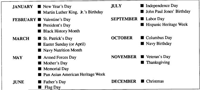 PLAN SPECIAL MENUS Meals have three roles in Navy life: (1) to support physical health and fitness, (2) to build morale, and (3) to provide an occasion for socializing. Holiday or Special Event Menus Special meals for holidays or special meal celebrations (in GMs either afloat or ashore) provide opportunities for festivity among the crew. A well-planned special meal adds interest and creates real enthusiasm among the MSs and crew. PREPARATION.- Creative menus may be planned using foods traditionally associated with the holiday. Research through the AFRS and the Navy Food Service, NAVSUP P-476, files should supply new ideas. Fi ure 7-10 is a calendar listing special occasions generally celebrated. It is included for a handy reference. The meal patterns suggested for breakfast, lunch, and dinner may be changed for holiday or specialty meals to include some extras for the celebration. Well-planned special meals will add interest and enthusiasm among cooks and patrons. They can be as simple or elaborate as time, personnel, and cost permit. PRINTING.- Some GMs may have fancy menus printed for their entire cycle menu or for special events or holidays. The printed menu gives a kind of flavor of its own to special meals. These menus need not be elaborate to be attractive. They can be simply produced using a graphics program on a computer or you can have them produced professionally through the supply system. Usually if menus are to be printed professionally, they are either going to be used permanently for a cycle menu or for holiday menus repeating from year to year. Brunch Menus A brunch is neither breakfast nor lunch. Brunch is something of each of these meals, yet it has its own special identity. The distinguishing features of brunch are time of service and the special-occasion, leisurely atmosphere that can accompany a brunch meal. The brunch meal is usually served between breakfast and lunch time, generally on weekends and holidays. Brunch menus need not be elaborate to be attractive and satisfying. A number of menu items maybe added to a heavy breakfast meal to make a brunch meal. These