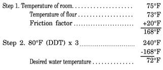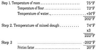 General Breadmaking Procedures The processes described next include not only the steps that you, the baker, perform, but also the processes that take place within the dough as a result of your action. When actually preparing bread, you should always follow the steps and procedures in the Armed Forces Recipe Service (AFRS). MIXING.-After you select and weigh or measure the necessary ingredients, the next important step is mixing. Dough may be mixed by hand, but an electric mixer or a bread-dough machine will make the job easier. Dough Temperatures During Mixing.Temperature has a definite influence on the function of yeast and its ability to condition a dough properly to produce a quality bread. The desired dough temperature (DDT) is obtained from the recipe card. The temperature of the dough can be regulated by considering all the factors that will influence the temperature of the dough and then using water at a temperature that will offset the adverse temperatures. Any desired temperature of the dough when it leaves the mixer may be obtained by a rather simple calculation that first determines the friction factor (temperature rise induced by mixing) and may then be used at all times when the same mixer and the same weight of dough are used. Determine the friction factor by competing the following steps: 1. Add the temperature of the room, the temperature of the flour, and the temperature of the water. 2. Multiply the temperature of the mixed sample dough by 3. 3. Subtract the first answer from the second answer. For example: