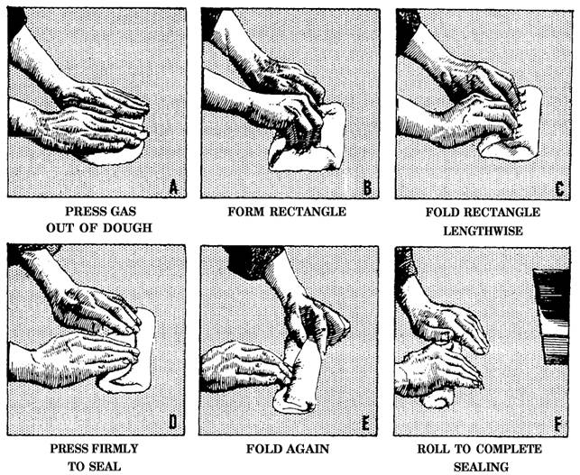 Figure 8-1.-Molding and shaping bread dough. temperature also vaporizes moisture on the surface of the bread and ultimately causes caramelization of the sugars, starches, and other ingredients that make up the exposed dough surface. The oven temperature and the time required to bake a loaf of bread will vary, depending on several factors. When using convection ovens, follow the operating manual instructions or use the AFRS guideline card for convection ovens. Baking time is shorter and temperature is lower in a convection oven than in a conventional oven. Remember that some bread recipes will contain convection oven information as a note. Bread is the end product of a long line of chemical and physical reactions. If the loaf is removed from the oven before these changes occur, no matter what crust color is obtained, the loaf will lack desirable qualities. Color and thickness of crust depend on the length of time the loaf is subjected to oven temperature and on the concentration of sugars. Aroma of underbaked bread is "green," lacking the full-scale, delicious fragrance characteristic of freshly baked bread. If sufficiently underbaked, the loaf sides will collapse and proper slicing is not possible. The oven temperature may be controlled for the purpose of influencing bread character in other ways than just the color. A low oven temperature tends to open the grain of the loaf. If too high a temperature is used, the loaf may burst in a rather violent manner, usually along the sides, that results in a misshapen loaf. A properly baked loaf of bread sounds hollow when tapped. Remove the baked loaves of bread from pans and cool on racks in areas free from drafts. Bread will dry out more quickly if the air is either too warm or too dry. COOLING.- After the bread is done, remove the loaves from the pans and place them on racks to cool, making sure there is at least a 1-inch space between loaves. Cooling usually takes from 1 1/2 to 2 hours. Bread should not be covered while it is warm STORING AND SERVING.- Bread should be stored at cool room temperature under conditions where it will not dry out. If wrapped in plastic bags that are closed with twisters, bread can be stored for up to 96 hours in a cool room. If the room is hot and humid, it may be necessary to store the bread under refrigeration to prevent mold from forming. Refrigeration is not ideal, however, for extended storage because bread stales more rapidly under refrigeration than it does at room temperature. This staling makes the bread firm and the crumb becomes coarse and hard. Bread may be held for extended periods if frozen in plastic wrap or bags. If freezer storage is impractical, bread quality is best maintained by baking in quantities that will be consumed within 48 hours. The bread storage should be arranged so that the older bread always can be used first. Sliced bread left over from a previous meal can be thoroughly dried and used for bread crumbs, bread pudding, or crouton preparation. SHORT-TIME FORMULA.- This formula was developed to meet a critical need aboard Navy ships with limited bakery space. The short-time formula eliminates both the intermediate proof and the final loaf-molding operation. This modified sponge-type dough produces a good loaf of bread. More importantly, ships without production equipment can produce bread within 2 to 2 1/2 hours. In addition to eliminating the 8- to 10-minute intermediate proof, the baker can roll the rounded pieces into a sausage shape and pan-one person being able to roll and pan an average of 20 per minute. Hot rolls and variations may be prepared using the short-time formula. Follow the AFRS for best results. A room temperature of 80F should be maintained to assure the desired finished product. Any increase in the bakeshop temperature will, of course, reduce the fermentation time. Because of the absence of fermentation rooms aboard ship, this control is strictly dependent on the baker's skill and knowledge in determining the readiness of the dough. Mixing time will not change, however, as the 10-minute periods appear to be optimum for proper dough development under practically all conditions. |