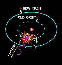 Once the electron has been elevated to an energy level higher than the lowest possible energy level, the atom is said to be in an excited state. The electron will not remain in this excited condition for more than a fraction of a second before it will radiate the excess energy and return to a lower energy orbit. To illustrate this principle, assume that a normal electron has just received a photon of energy sufficient to raise it from the first to the third energy level. In a short period of time the electron may jump back to the first level emitting a new photon identical to the one it received. A second alternative would be for the electron to return to the lower level in two jumps; from the third to the second, and then from the second to the first. In this case the electron would emit two photons, one for each jump. Each of these photons would have less energy than the original photon which excited the electron. This principle is used in the fluorescent light where ultraviolet light photons, which are not visible to the human eye, bombard a phosphor coating on the inside of a glass tube. The phosphor electrons, in returning to their normal orbits, emit photons of light that are visible. By using the proper chemicals for the phosphor coating, any color of light may be obtained, including white. This same principle is also used in lighting up the screen of a television picture tube. The basic principles just developed apply equally well to the atoms of more complex elements. In atoms containing two or more electrons, the electrons interact with each other and the exact path of any one electron is very difficult to predict. However, each electron lies in a specific energy band and the orbits will be considered as an average of the electron's position.