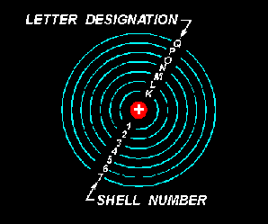 Shells and Subshells The difference between the atoms, insofar as their chemical activity and stability are concerned, is dependent upon the number and position of the electrons included within the atom. How are these electrons positioned within the atom? In general, the electrons reside in groups of orbits called shells. These shells are elliptically shaped and are assumed to be located at fixed intervals. Thus, the shells are arranged in steps that correspond to fixed energy levels. The shells, and the number of electrons required to fill them, may be predicted by the employment of Pauli's exclusion principle. Simply stated, this principle specifies that each shell will contain a maximum of 2n2electrons, where n corresponds to the shell number starting with the one closest to the nucleus. By this principle, the second shell, for example, would contain 2(2)2 or 8 electrons when full. In addition to being numbered, the shells are also given letter designations, as pictured in figure 1-3. Starting with the shell closest to the nucleus and progressing outward, the shells are labeled K, L, M, N, O, P, and Q, respectively. The shells are considered to be full, or complete, when they contain the following quantities of electrons: two in the K shell, eight in the L shell, 18 in the M shell, and so on, in accordance with the exclusion principle. Each of these shells is a major shell and can be divided into subshells, of which there are four, labeled s, p, d, and f. Like the major shells, the subshells are also limited as to the number of electrons which they can contain. Thus, the "s" subshell is complete when it contains two electrons, the "p" subshell when it contains 10, and the "f" subshell when it contains 14 fourteen electrons.