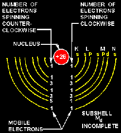Domain Theory A more modern theory of magnetism is based on the electron spin principle. From the study of atomic structure it is known that all matter is composed of vast quantities of atoms, each atom containing one or more orbital electrons. The electrons are considered to orbit in various shells and subshells depending upon their distance from the nucleus. The structure of the atom has previously been compared to the solar system, wherein the electrons orbiting the nucleus correspond to the planets orbiting the sun. Along with its orbital motion about the sun, each planet also revolves on its axis. It is believed that the electron also revolves on its axis as it orbits the nucleus of an atom. It has been experimentally proven that an electron has a magnetic field about it along with an electric field. The effectiveness of the magnetic field of an atom is determined by the number of electrons spinning in each direction. If an atom has equal numbers of electrons spinning in opposite directions, the magnetic fields surrounding the electrons cancel one another, and the atom is unmagnetized. However, if more electrons spin in one direction than another, the atom is magnetized. An atom with an atomic number of 26, such as iron, has 26 protons in the nucleus and 26 revolving electrons orbiting its nucleus. If 13 electrons are spinning in a clockwise direction and 13 electrons are spinning in a counterclockwise direction, the opposing magnetic fields will be neutralized. When more than 13 electrons spin in either direction, the atom is magnetized. An example of a magnetized atom of iron is shown in figure 1-12.