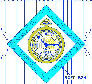 The sensitive mechanisms of electric instruments and meters can be influenced by stray magnetic fields which will cause errors in their readings. Because instrument mechanisms cannot be insulated against magnetic flux, it is necessary to employ some means of directing the flux around the instrument. This is accomplished by placing a soft-iron case, called a MAGNETIC SCREEN or SHIELD, about the instrument. Because the flux is established more readily through the iron (even though the path is longer) than through the air inside the case, the instrument is effectively shielded, as shown by the watch and soft-iron shield in figure 1-18.