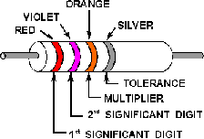 Use the example colors shown in figure 1-31.Since red is the color of the first band, the first significant digit is 2. The second band is violet, therefore the second significant digit is 7. The third band is orange, which indicates that the number formed as a result of reading the first two bands is multiplied by 1000. In this case 27 1000 = 27,000 ohms. The last band on the resistor indicates the tolerance; that is, the manufacturer's allowable ohmic deviation above and below the numerical value indicated by the resistor's color code. In this example, the color silver indicates a tolerance of 10 percent. In other words, the actual value of the resistor may fall somewhere within 10 percent above and 10 percent below the value indicated by the color code. This resistor has an indicated value of 27,000 ohms. Its tolerance is 10 percent 27,000 ohms, or 2,700 ohms. Therefore, the resistor's actual value is somewhere between 24,300 ohms and 29,700 ohms. When measuring resistors, you will find situations in which the quantities to be measured may be extremely large, and the resulting number using the basic unit, the ohm, may prove too cumbersome. Therefore, a metric system prefix is usually attached to the basic unit of measurement to provide a more manageable unit. Two of the most commonly used prefixes are kilo and mega. Kilo is the prefix used to represent thousand and is abbreviated k. Mega is the prefix used to represent million and is abbreviated M. In the example given above, the 27,000-ohm resistor could have been written as 27 kilohms or 27 kW. Other examples are: 1,000 ohms = 1 kW; 10,000 ohms = 10 kW; 100,000 ohms = 100 kW. Likewise, 1,000,000 ohms is written as 1 megohm or 1 MW and 10,000,000 ohms = 10 MW.