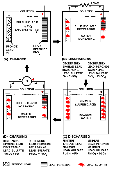 Figure 2-3. - Secondary cell. Figure 2-3 view A shows a lead-acid secondary cell that is fully charged. The cathode is pure sponge lead, the anode is pure lead peroxide, and the electrolyte is a mixture of sulfuric acid and water. Figure 2-3 view B shows the secondary cell discharging. A load is connected between the cathode and anode; current flows negative to positive as shown. This current flow creates the same process as was explained for the primary cell with the following exceptions. In the primary cell the zinc cathode was eaten away by the sulfuric acid. In the secondary cell the sponge-like construction of the cathode retains the lead sulfate formed by the chemical action of the sulfuric acid and the lead. In the primary cell the carbon anode was not chemically acted upon by the sulfuric acid. In the secondary cell the lead peroxide anode is chemically changed to lead sulfate by the sulfuric acid. When the cell is fully discharged it will be as shown in figure 2-3 view C. The anode and cathode retain some lead peroxide and sponge lead but the amounts of lead sulfate in each is maximum. The electrolyte has a minimum amount of sulfuric acid. With this condition no further chemical action can take place within the cell. As you know, the secondary cell can be recharged. Recharging is the process of reversing the chemical action that occurs as the cell discharges. To recharge the cell, a voltage source, such as a generator, is connected as shown in figure 2-3 view D. The negative terminal of the voltage source is connected to the cathode of the cell and the positive terminal of the voltage source is connected to the anode of the cell. With this arrangement the lead sulfate is chemically changed back to sponge lead in the cathode, lead peroxide in the anode, and sulfuric acid in the electrolyte. After all the lead sulfate is chemically changed, the cell is fully charged as shown in figure 2-3 view A. Once the cell has been charged, the discharge-charge cycle may be repeated.