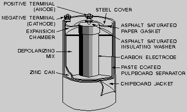 PRIMARY DRY CELL The dry cell is the most popular type of primary cell. It is ideal for simple applications where an inexpensive and noncritical source of electricity is all that is needed. The dry cell is not actually dry. The electrolyte is not in a liquid state, but is a moist paste. If it should become totally dry, it would no longer be able to transform chemical energy to electrical energy. The construction of a common type of dry cell is shown in figure 2-4. These dry cells are also referred to as Leclanche' cells. The internal parts of the cell are located in a cylindrical zinc container. This zinc container serves as the negative electrode (cathode) of the cell. The container is lined with a nonconducting material, such as blotting paper, to separate the zinc from the paste. A carbon electrode is located in the center, and it serves as the positive terminal (anode) of the cell. The paste is a mixture of several substances such as ammonium chloride, powdered coke, ground carbon, manganese dioxide, zinc chloride, graphite, and water.