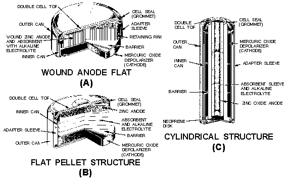Figure 2-5. - Mercury cells. In the pressed-powder cells, shown in figure 2-5 views B and C, the zinc powder for the anode is mixed prior to being pressed into shape. The absorbent shown in the figure is paper soaked in the electrolyte. The space between the inner and outer containers provides passage for any gas generated by an improper chemical balance or impurities present within the cell. If the anode and cathode of a cell are connected together without a load, a SHORT CIRCUIT condition exists. Short circuits (shorts) can be very dangerous. They cause excessive heat, pressure, and current flow which may cause serious damage to the cell or be a safety hazard to personnel. WARNING |