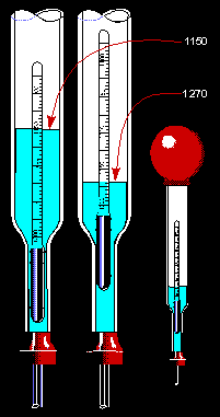 has a specific gravity greater than 1.0. The Hydrometer A hydrometer, shown in figure 2-12, is a glass syringe with a float inside it. The float is a hollow glass tube sealed at both ends and weighted at the bottom end, with a scale calibrated in specific gravity marked on its side. To test an electrolyte, draw it into the hydrometer using the suction bulb. Draw enough electrolyte into the hydrometer to make the float rise. Do not draw in so much electrolyte that the float rises into the suction bulb. The float will rise to a point determined by the specific gravity of the electrolyte. If the electrolyte contains a large amount of active ingredient, its specific gravity will be relatively high. The float will rise higher than it would if the electrolyte contained only a small amount of active ingredient.