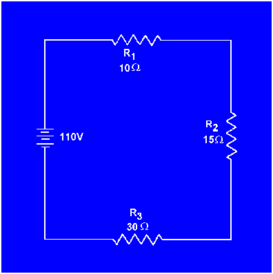 Example: In figure 3-14 a series circuit consisting of three resistors: one of 10 ohms, one of 15 ohms, and one of 30 ohms, is shown. A voltage source provides 110 volts. What is the total resistance?