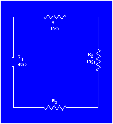 Example: In figure 3-15 the total resistance of a circuit containing three resistors is 40 ohms. Two of the circuit resistors are 10 ohms each. Calculate the value of the third resistor (R3 ).