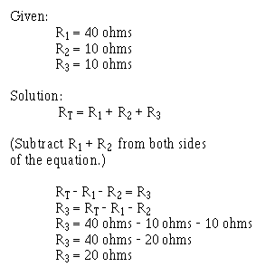 In some circuit applications, the total resistance is known and the value of one of the circuit resistors has to be determined. The equation RT = R1 + R2 + R3 can be transposed to solve for the value of the unknown resistance.