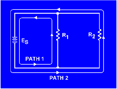 Start at the voltage source (Es) and trace counterclockwise around the circuit. Two complete and separate paths can be identified in which current can flow. One path is traced from the source, through resistance R1, and back to the source. The other path is from the source, through resistance R2, and back to the source.
