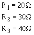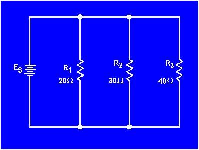 Example: Three resistors are connected in parallel as shown in figure 3-46. The resistor values are: R1 = 20 ohms, R2 = 30 ohms, R3 = 40 ohms. What is the equivalent resistance? (Use the reciprocal method.)
