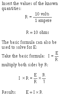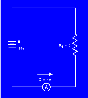 Refer to figure 3-3 where E equals 10 volts and I equals 1 ampere. Solve for R, using the equation just explained.