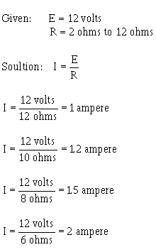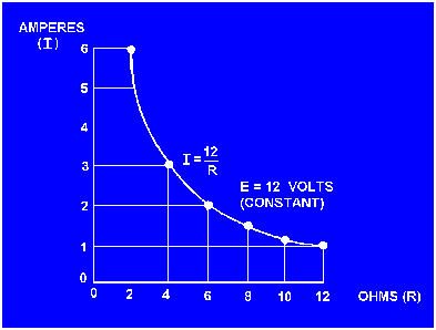 When the voltage across a load is held constant, the current depends solely upon the resistance of the load. For example, figure 3-8 shows a graph with the voltage held constant at 12 volts. The independent variable is the resistance which is varied from 2 ohms to 12 ohms. The current is the dependent variable. Values for current can be calculated as: