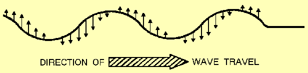 TRANSVERSE WAVES To explain transverse waves, we will again use our example of water waves. Figure 1-3 is a cross section diagram of waves viewed from the side. Notice that the waves are a succession of crests and troughs. The wavelength (one 360 degree cycle) is the distance from the crest of one wave to the crest of the next, or between any two similar points on adjacent waves. The amplitude of a transverse wave is half the distance measured vertically from the crest to the trough. Water waves are known as transverse waves because the motion of the water is up and down, or at right angles to the direction in which the waves are traveling. You can see this by observing a cork bobbing up and down on water as the waves pass by; the cork moves very little in a sideways direction. In figure 1-4, the small arrows show the up-and-down direction the cork moves as the transverse wave is set in motion. The direction the wave travels is shown by the large arrow. Radio waves, light waves, and heat waves are examples of transverse waves. Figure 1-3. - Elements of a wave.