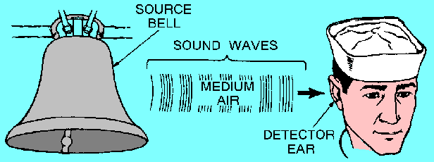 Q.6 What are some examples of transverse waves? MEDIUM We have used the term medium in describing the motion of waves. Since medium is a term that is used frequently in discussing propagation, it needs to be defined so you will understand what a medium is and its application to propagation. A MEDIUM is the vehicle through which the wave travels from one point to the next. The vehicle that carries a wave can be just about anything. An example of a medium, already mentioned, is air. Air, as defined by the dictionary, is the mixture of invisible, odorless, tasteless gases that surrounds the earth (the atmosphere). Air is made up of molecules of various gases (and impurities). We will call these molecules of air particles of air or simply particles. Figure 1-6 will help you to understand how waves travel through air. The object producing the waves is called the SOURCE - a bell in this illustration. The object responding to the waves is called a DETECTOR or RECEIVER - in this case, the human ear. The medium is air, which is the means of conveying the waves from the source to the detector. The source, detector, and medium are all necessary for wave motion and wave propagation (except for electromagnetic waves which require no medium). The waves shown in figure 1-6 are sound waves. As the bell is rung, the particles of air around the bell are compressed and then expanded. This compression and expansion of particles of air set up a wave motion in the air. As the waves are produced, they carry energy from particle to particle through the medium (air) to the detector (ear). Figure 1-6. - The three elements of sound.