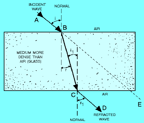Refraction When a wave passes from one medium into another medium that has a different velocity of propagation, a change in the direction of the wave will occur. This changing of direction as the wave enters the second medium is called REFRACTION. As in the discussion of reflection, the wave striking the boundary (surface) is called the INCIDENT WAVE, and the imaginary line perpendicular to the boundary is called the NORMAL. The angle between the incident wave and the normal is called the ANGLE OF INCIDENCE. As the wave passes through the boundary, it is bent either toward or away from the normal. The angle between the normal and the path of the wave through the second medium is the ANGLE OF REFRACTION. A light wave passing through a block of glass is shown in figure 1-10. The wave moves from point A to B at a constant speed. This is the incident wave. As the wave penetrates the glass boundary at point B, the velocity of the wave is slowed down. This causes the wave to bend toward the normal. The wave then takes the path from point B to C through the glass and becomes BOTH the refracted wave from the top surface and the incident wave to the lower surface. As the wave passes from the glass to the air (the second boundary), it is again refracted, this time away from the normal and takes the path from point C to D. As the wave passes through the last boundary, its velocity increases to the original velocity. As figure 1-10 shows, refracted waves can bend toward or away from the normal. This bending depends on the velocity of the wave through each medium. The broken line between points B and E is the path that the wave would travel if the two mediums (air and glass) had the same density. Figure 1-10. - Refraction of a wave.