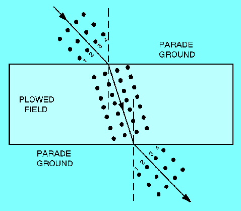 To summarize what figure 1-10 shows: If the wave passes from a less dense medium to a more dense medium, it is bent toward the normal, and the angle of refraction (r) is less than the angle of incidence (i). If the wave passes from a more dense to a less dense medium, it is bent away from the normal, and the angle of refraction (r1) is greater than the angle of incidence (i1). You can more easily understand refraction by looking at figure 1-11. There is a plowed field in the middle of a parade ground. Think of the incident wave as a company of recruits marching four abreast at an angle across the parade ground to the plowed field, then crossing the plowed field and coming out on the other side onto the parade ground again. As the recruits march diagonally across the parade ground and begin to cross the boundary onto the plowed field, the front line is slowed down. Because the recruits arrive at the boundary at different times, they will begin to slow down at different times (number 1 slows down first and number 4 slows down last in each line). The net effect is a bending action. When the recruits leave the plowed field and reenter the parade ground, the reverse action takes place. Figure 1-11. - Analogy of refraction.
