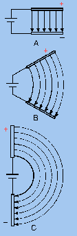 If the two plates of the capacitor are spread farther apart, the electric field must curve to meet the plates at right angles (fig. 1-26). The straight lines in view A of figure 1-26 become arcs in view B, and approximately semicircles in view C, where the plates are in a straight line. Instead of flat metal plates, as in the capacitor, the two elements can take the form of metal rods or wires and form the basic antenna. Figure 1-26. - Electric fields between plates at different angles.